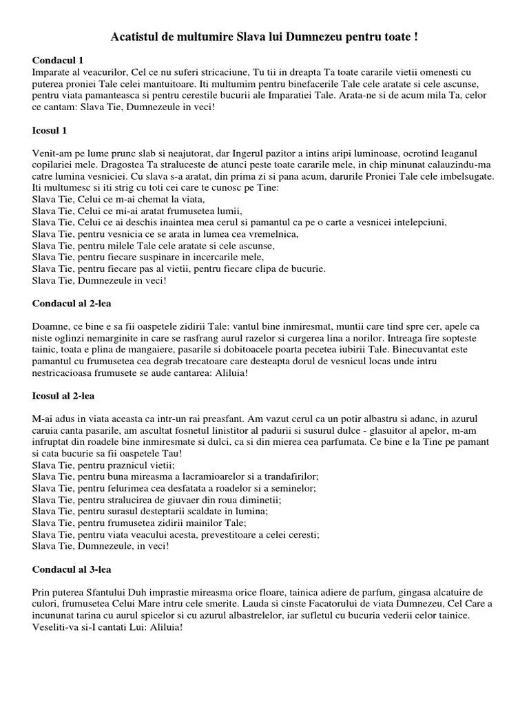 Slavă ţie, dumnezeul nostru, slavă ţie! Împărate al veacurilor, cel ce nu suferi stricăciune, tu ţii în dreapta ta toate cărările vieţii omeneşti cu puterea proniei tale celei mântuitoare. Acatistul de mulţumire „slavă lui dumnezeu pentru toate!". Amin slavă ţie, dumnezeul nostru, slavă ţie! Slavă ţie, dumnezeul nostru, slavă ţie! Împărate ceresc, mângâietorule, duhul adevărului, care pretutindeni eşti şi toate le plineşti, vistierul bunătăţilor şi …. Împărate al veacurilor, cel ce nu suferi stricăciune, tu ţii în dreapta ta toate cărările vieţii omeneşti cu puterea proniei tale celei mântuitoare.