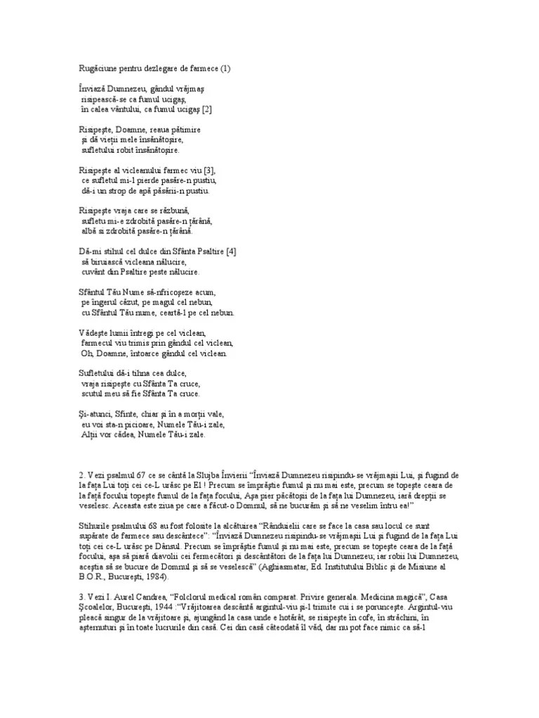 29.08.2018 · părintele cleopa, despre farmece și vrăjitorii. Împiedică tu, doamne dumnezeul părinților noștri, toată lucrarea satanei, tu, cel ce dai dezlegare de magie, de farmece, de vrăji și de toate lucrările satanicești și de toate legăturile lui, și distruge toată lucrarea vicleană prin pomenirea prea sfântului tău nume, … În fiecare zi se fac următoarele rugăciuni: 24.02.2020 · 3 rugaciuni de dezlegare de farmece si vraji a sf. Doamnele nu au voie să citească rugăciunea dacă sunt în timpul necurăției lunare.. Doamnele nu au voie să citească rugăciunea dacă sunt în timpul necurăției lunare.