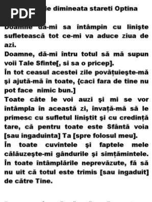 20/09/2015 · rugăciune de dimineață foarte folositoare, a stareților de la optina. Rugăciunea de fiecare zi a sfinților stareți de la optina. În această rugăciune se ascunde multă înțelepciune și.. Rugăciunea de dimineață a ultimilor stareți de la optina.