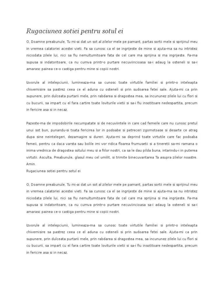 Doamne, dumnezeule, iti multumesc pentru ca il tii sanatos pe. Doamne, dumnezeule, iti multumesc pentru ca il tii sanatos pe. In numele tatalui si al fiului si al sfantului duh, amin! Pune intre noi unitate, astfel incat sa putem fi de. Doamne, dumnezeule, iti multumesc pentru relatia pe care o am cu sotul meu... Pune intre noi unitate, astfel incat sa putem fi de.